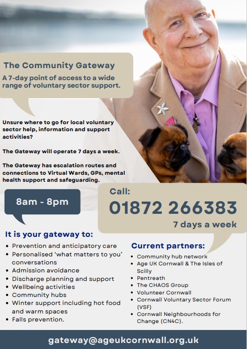 The Community Gateway is now live. Open 7 days a week, from 8am until 8pm, it offers a simple point of access into community support. It can connect to the Warm Banks network, community hubs, offer support on hospital discharge, help people navigate to the right place at the right time, and is a safe space for conversation. Although hosted by Age UK Cornwall, the Gateway offers the skills and experience of an inclusive range of charities and VCSE organisations.